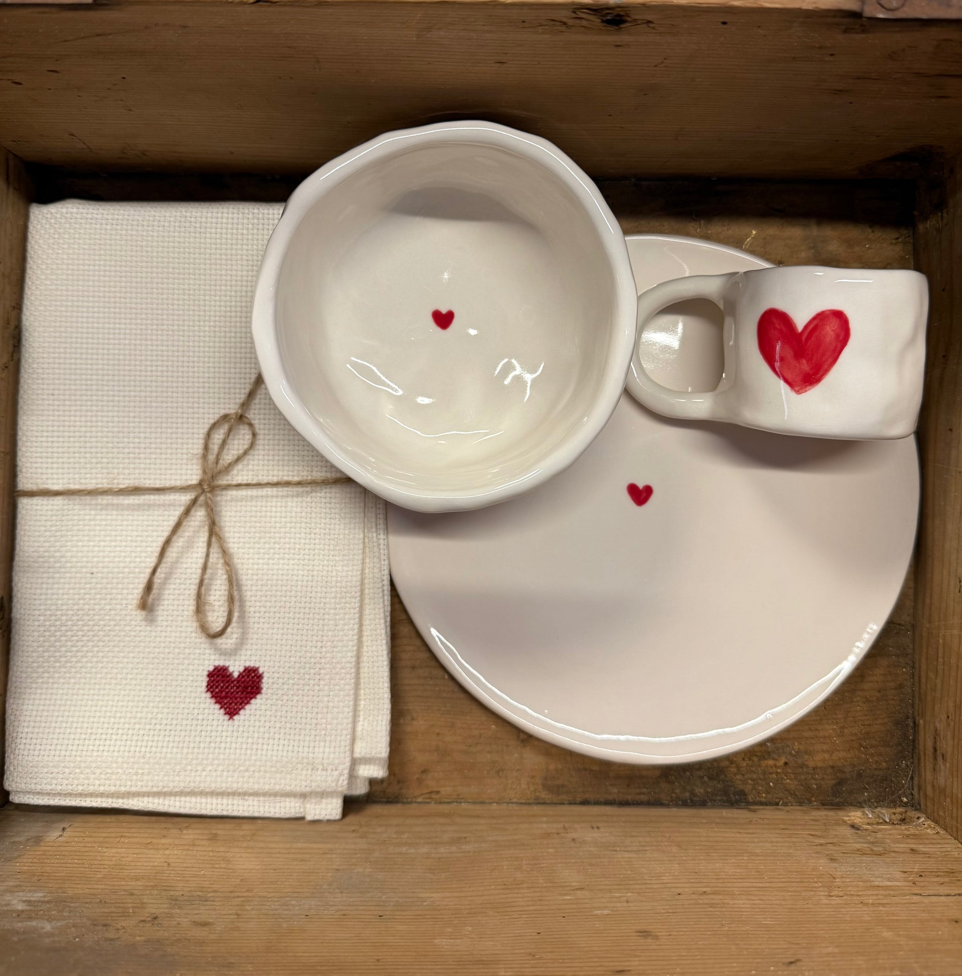 Box regalo composta da: 1 ciotola da yogurt, 1 mini mug, 1 piattino. Con tovaglietta con cuori.