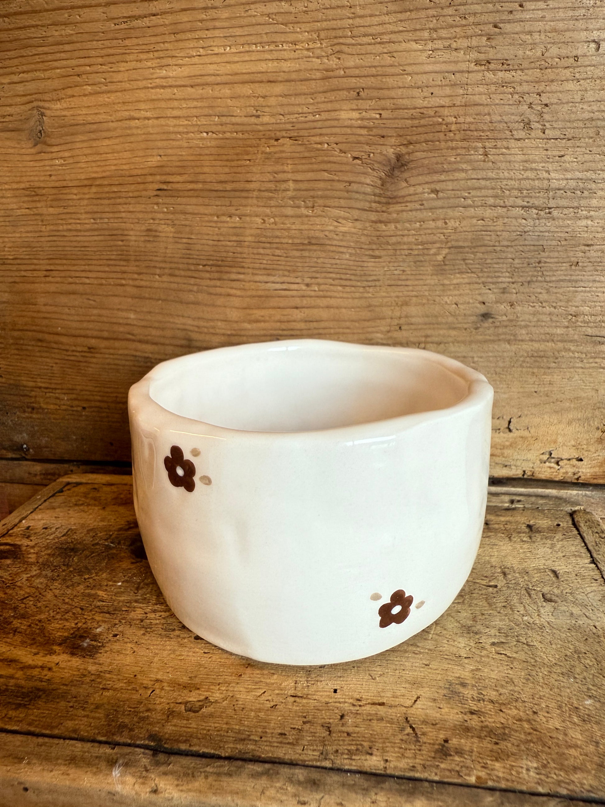 Piccola ciotola in ceramica bianca, ideale per la colazione, uno spuntino leggero o un dessert. Ogni fiorellino è dipinto a mano, rendendo ogni pezzo unico e delicatamente poetico.