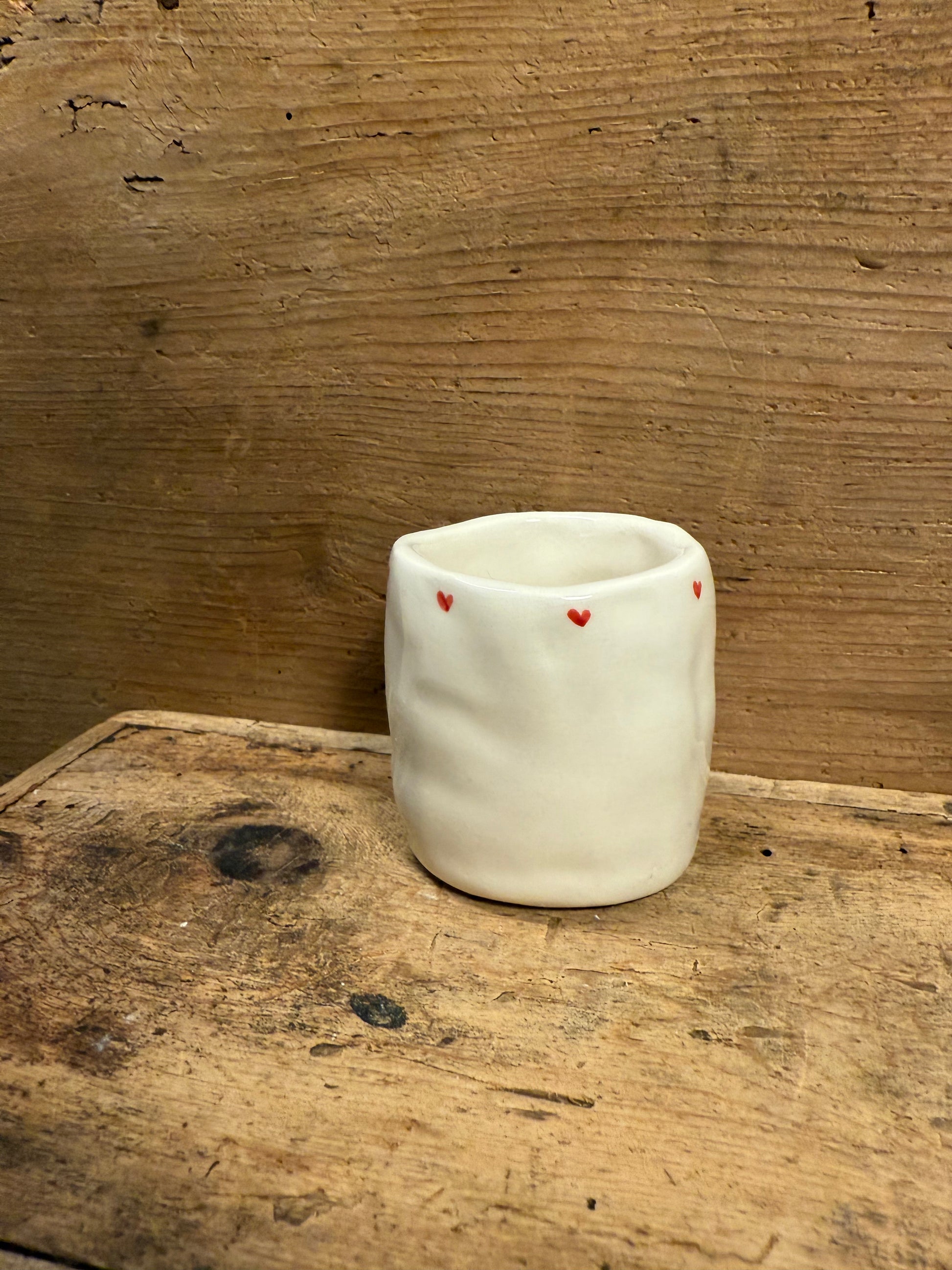 Tazzina da caffè artigianale realizzata a mano con argilla bianca e decorata con cuoricini. Ogni dettaglio è dipinto a mano con amore, rendendo ogni pezzo unico e delicato.