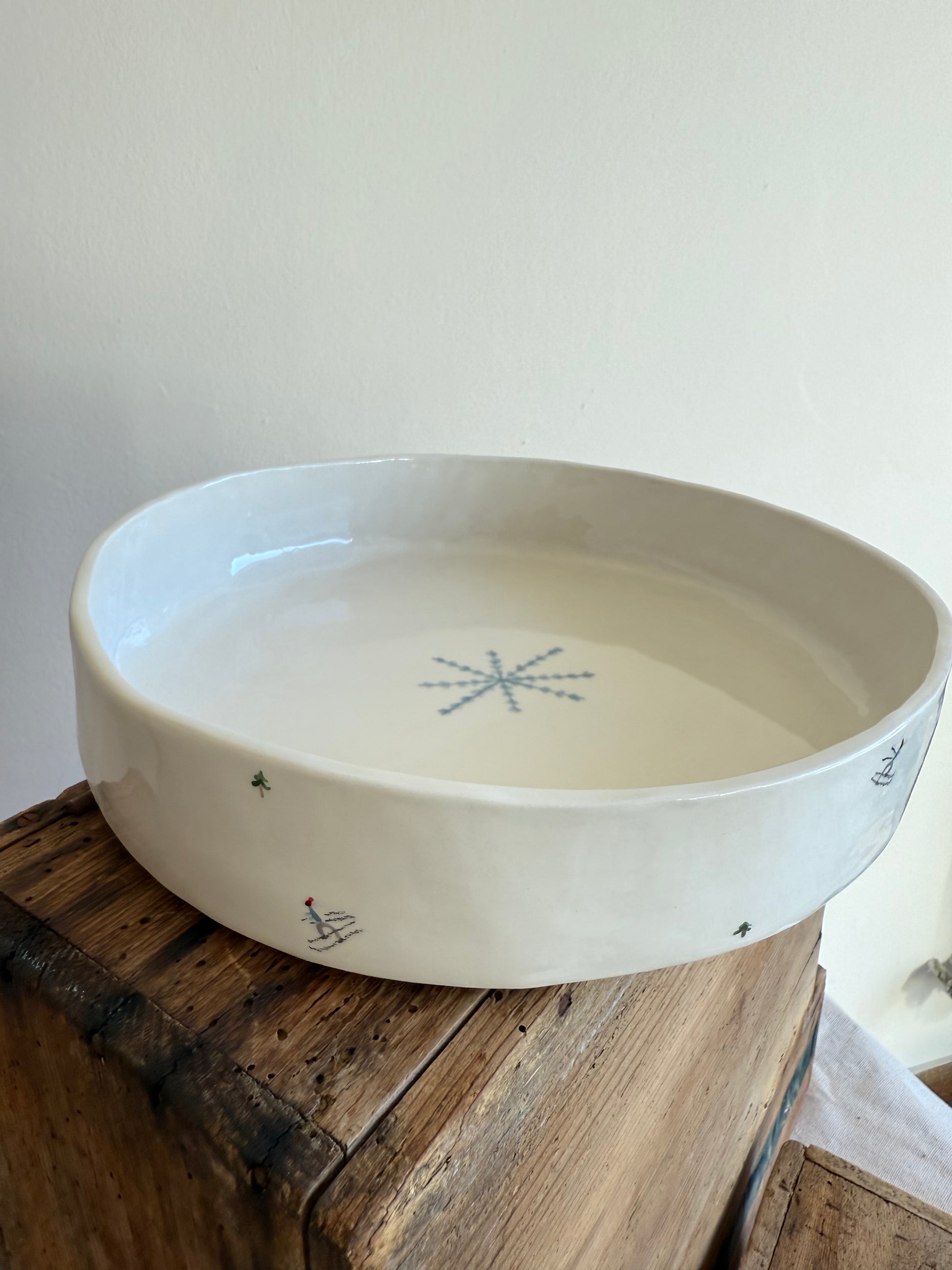 Tortiera rotonda realizzata interamente a mano con argilla bianca, decorato con sciatori. La sua forma irregolare racconta il gesto artigianale, rendendola un pezzo unico e poetico.